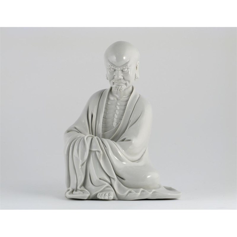A Chinese blanc de Chine figure of Siddharta Gautama as Sakyamuni, seated with his hands concealed beneath the folds of his robes, gaping at the neck to reveal his emaciated chest, his face contorted in a frown of determined meditation, impressed seal mark for pu zi yu ren (Virtue extends to all, even fishermen), possibly for the artist Su Xuejin, c.1900, 25cm.