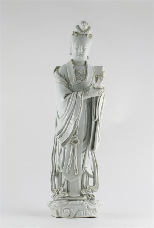 ** A massive Chinese blanc de Chine standing figure of Guanyin, holding a square cup in her left hand and raised on a cloud scroll base, the reverse with two seals, including a six character Wanli mark, 49cm.