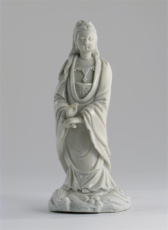 A Chinese blanc de Chine figure of Guanyin, wearing flowing robes and raised on a base of waves, 17th century, restoration to her fingers, 19.5cm.