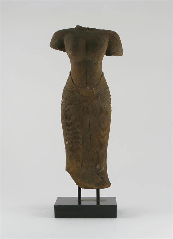 A red sandstone carving of a female torso, wearing a long finely pleated skirt, 48cm.