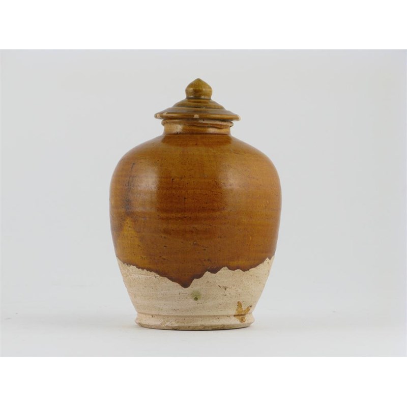 A Chinese pottery ovoid vase and cover, decorated with a splashed honey-coloured glaze, Tang dynasty, 618-907AD, 17.5cm. (2)