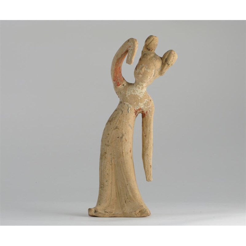 A Chinese pottery model of a woman, she stands in a dancing pose, traces of original pigment, Tang dynasty 618-907, 25cm. Together with an Oxford Authentication Thermoluminescence report, sample number C207F61.