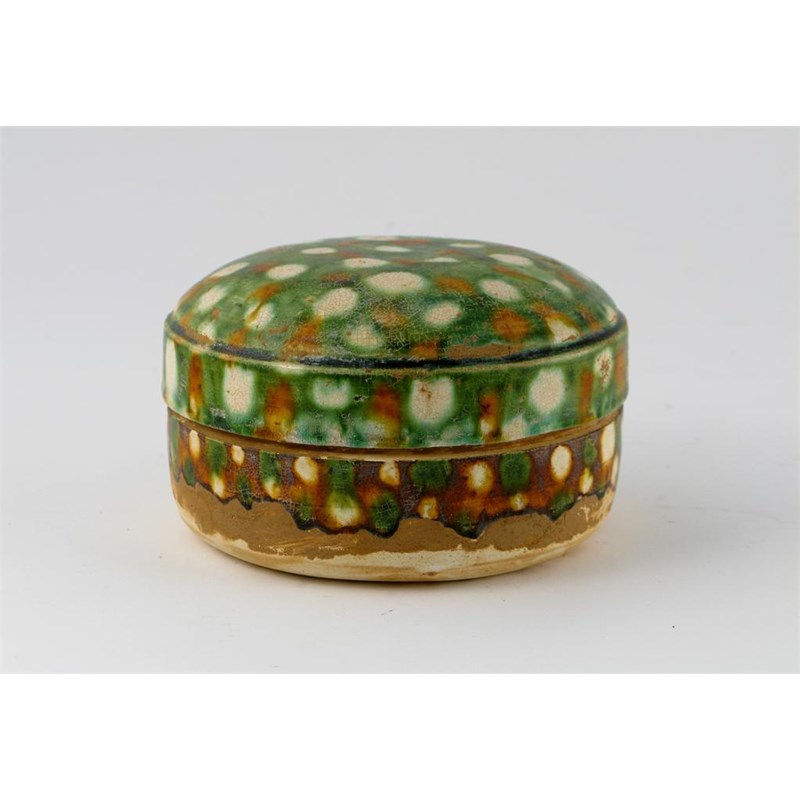 A Chinese sancai-glazed circular box and cover, decorated with a mottled glaze, Tang dynasty 618-907AD, chips, glaze wear and the lid possibly associated, 12cm. (2)