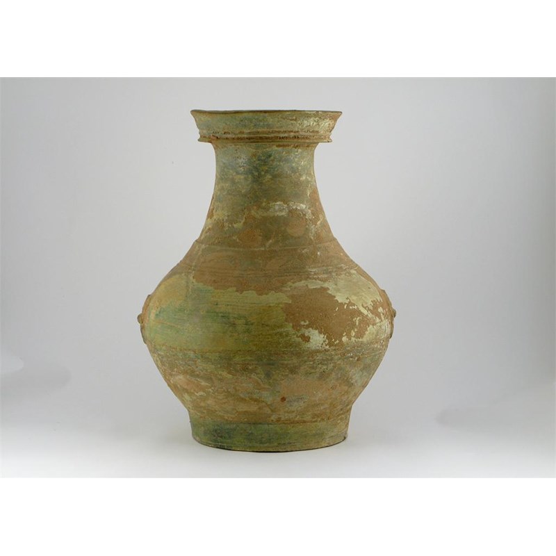 A large Chinese pottery vase, with moulded ring handles, and decorated with a degraded green lead glaze, Han dynasty 206BC-220AD, 45cm.