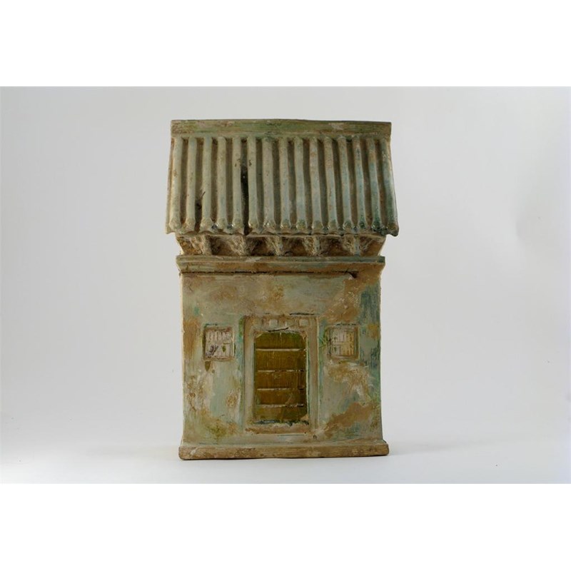 A Chinese pottery model of a house, with a ridged sloping roof and a door flanked by square windows, the surface with a lustrous degraded green glaze, Han dynasty 206BC - 220 AD, damaged and restored, 39cm.