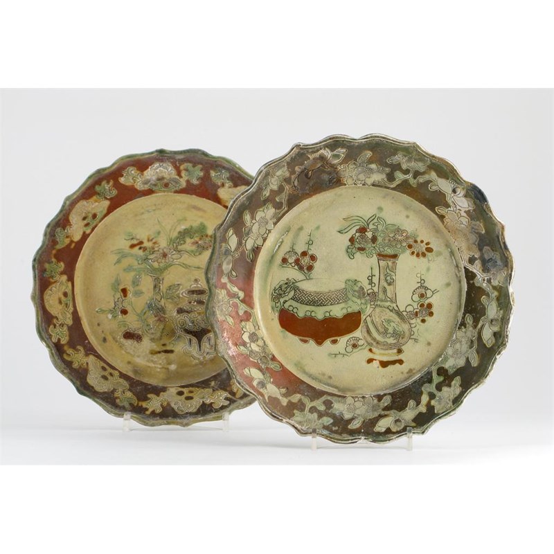 Two unusual Chinese pottery plates, painted with yellow, brown and green glazes, with vases of flowers against a straw glazed ground, c.1725, the glaze degraded, 22cm. (2) Cf. Sotheby's, The Ca Mau Shipwreck, 2007, lot 6 for similar examples.