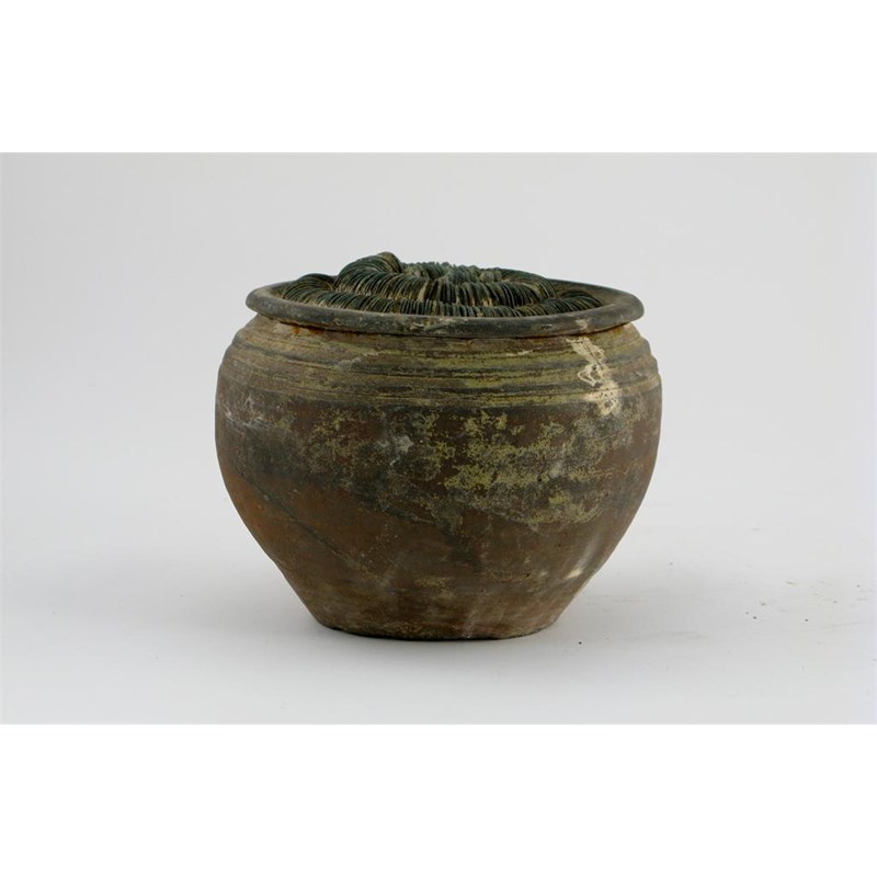 A rare Chinese pottery funerary jar of cash, filled with several thousand bronze coins arranged in concentric rings, Song dynasty, some damage to the foot, 15cm.