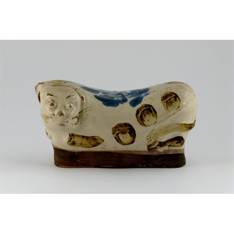 A Chinese Cizhou-style pottery pillow, modelled as a recumbent cat, painted with ochre splashes and blue flowers, 19th century, damages, 24cm.