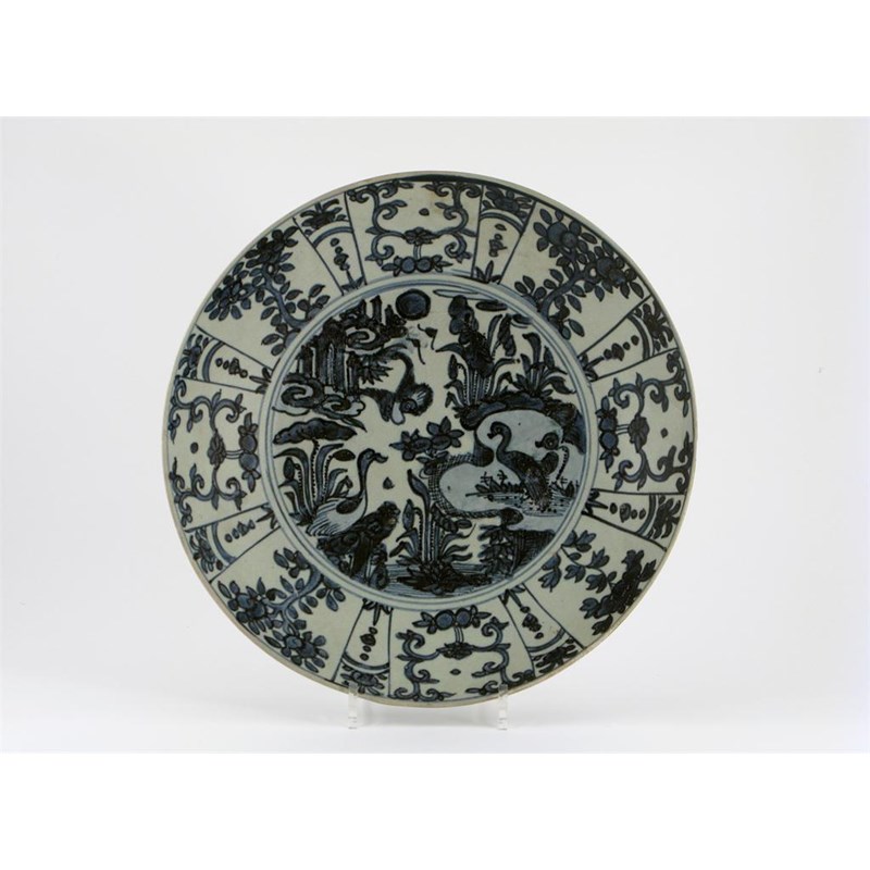 A Chinese blue and white Swatow-type dish, painted with ducks amidst aquatic plants within a wide panelled border design, minor damage and repairs, c.1600, 37cm. Cf. J. Welsh, Zhangzhou Export Ceramics, pp.75-77 a related example.