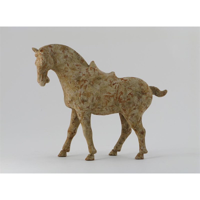 A Chinese pottery model of a horse, walking and saddled, Tang dynasty 618-907 AD, some damages, 25cm.