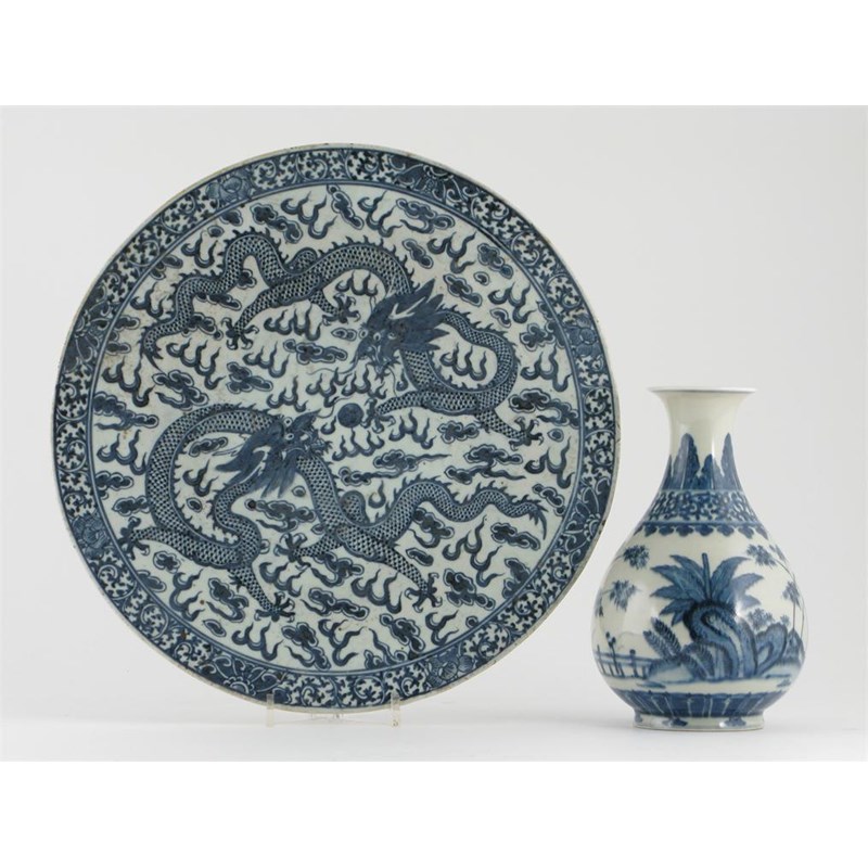 A Chinese blue and white roundel, painted with two scaly dragons in pursuit of the pearl of wisdom, 19th century, and a modern blue and white vase, 34cm.