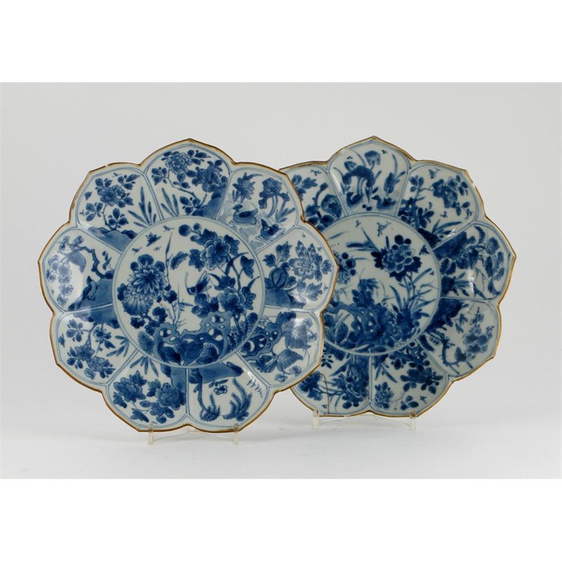 A pair of Chinese blue and white lotus-shaped dishes, painted with birds and insects amidst flowers and foliage, Kangxi 1662-1722, damages, 23cm. (2)