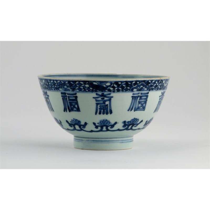A Chinese blue and white bowl, painted with a band of characters between stylized floral borders, the interior decorated with rockwork and flowers, four character mark 'Xuan yin tang zhi' for the Hall of Dark Shade, 18th century, minor chipping to the rim and other damage, 17.5cm.