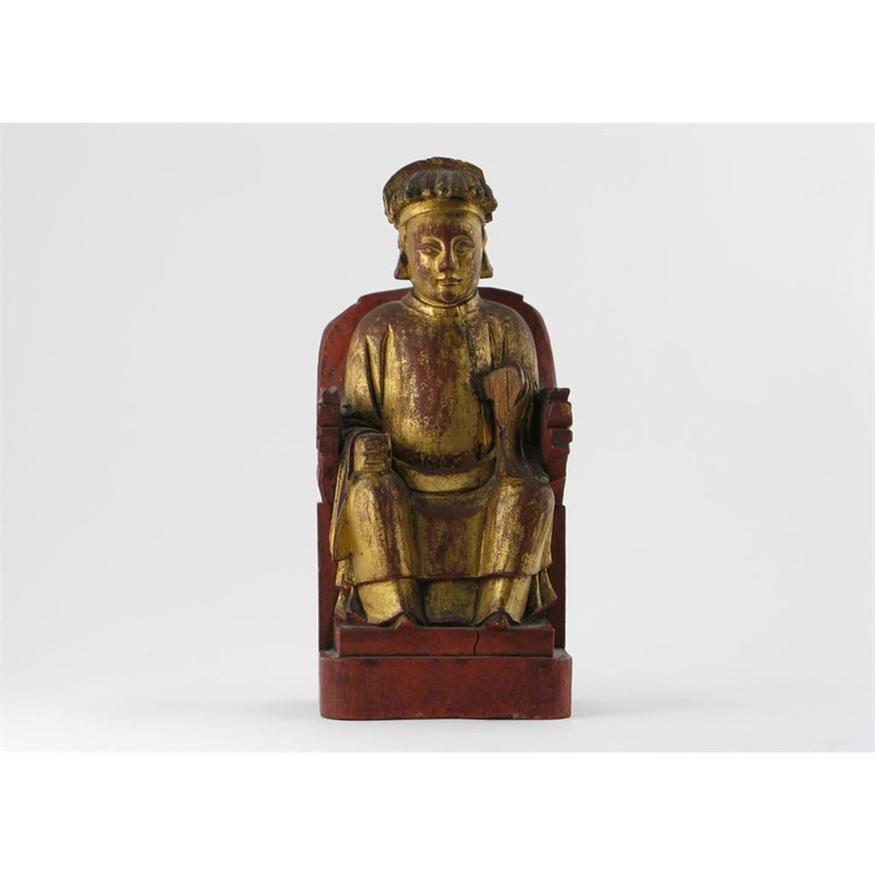 A Japanese carved wood model of a seated dignitary, decorated with gilding and red pigment, 19th century, some damages, 32cm.
