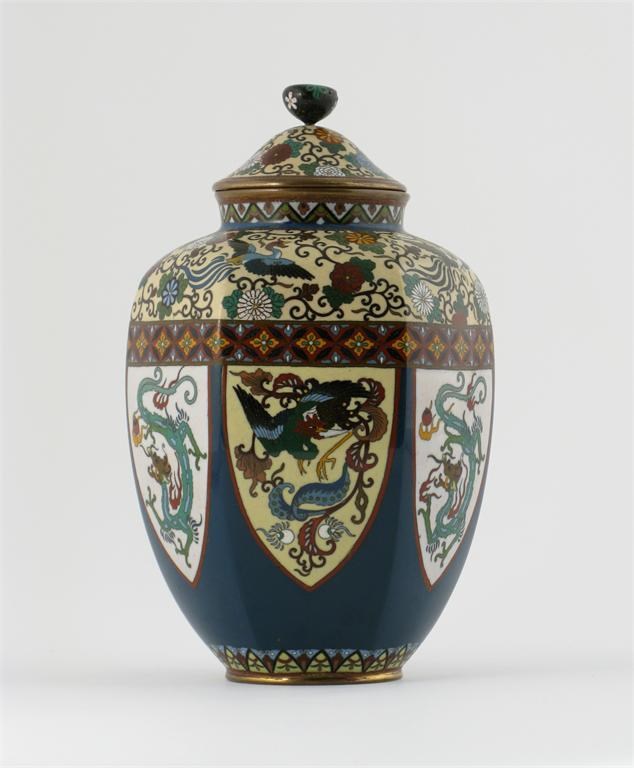 A Japanese cloisonn? hexagonal vase and cover, decorated with shield-shaped lappets containing dragons and phoenix, all on a blue ground, Meiji 1868-1912, 24.5cm. (2)