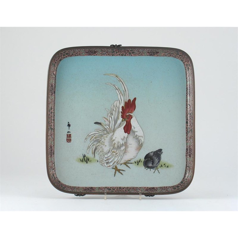 A Japanese cloisonn? square tray, decorated with a cockerel, a chick pecking at the grass at its feet, the rim decorated with dragonflies on a flower and foliage scroll, the reverse with a circular cartouche of fruit and nuts on a blue ground, two character inscription possibly Hosen and red seal, Meiji 1868-1912, 27.5cm.