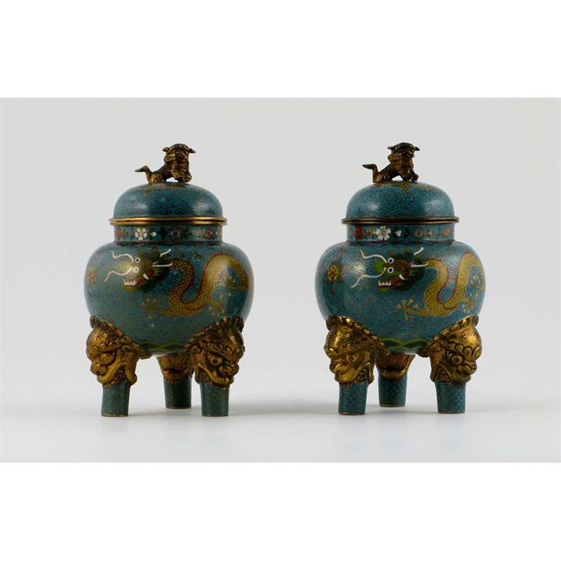 A pair of Chinese cloisonn? tripod censers and covers, each decorated with dragons chasing flaming pearls, 19th/20th century, 12.5cm. (4)