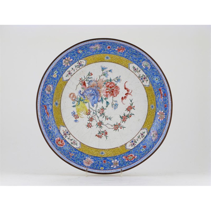 A Chinese Canton enamel dish, the centre brightly decorated with a finger citron, a bat, a fabulous fish and blossom, the reverse with two dragons in combat, surrounded by a yellow ground border with bats amidst scrolling flowers and foliage, firing cracks and repairs, 19th century, 26.4cm.