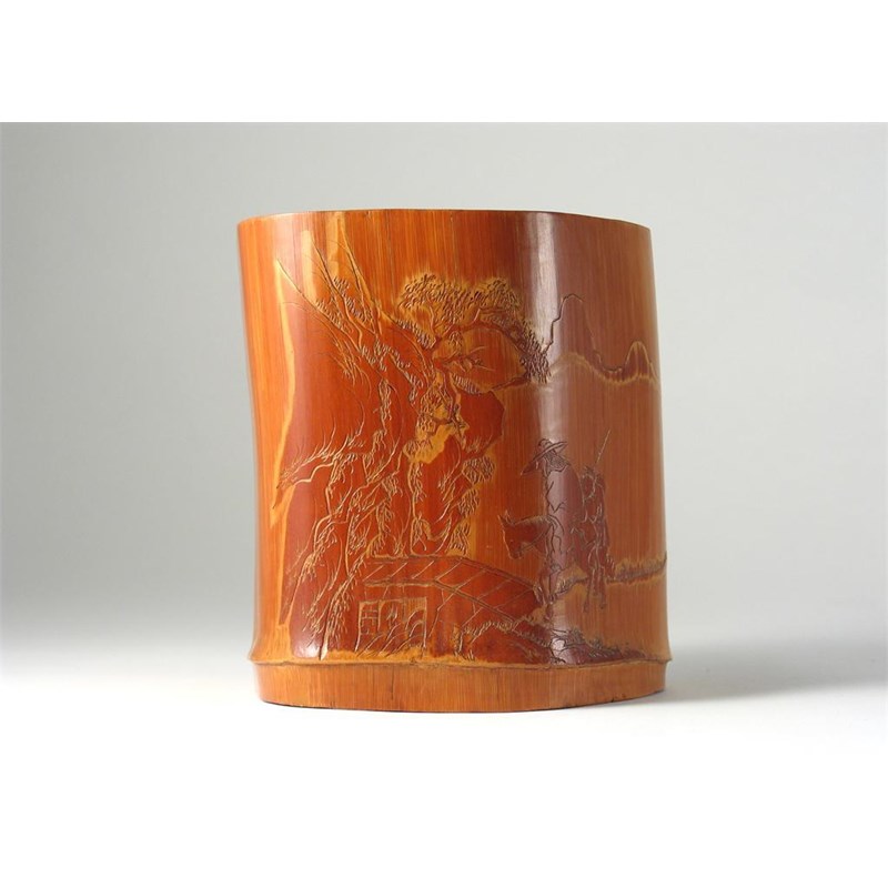 A Chinese bamboo brush pot, finely carved with figures on horseback in a rocky landscape, 19th century, 12.5cm.