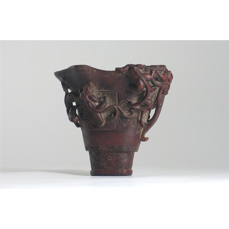 A Chinese carved bamboo libation cup, decorated with nine bifid dragons clambering around the body and over the rim. Small chips along the rim. 12.5cm.