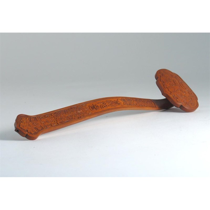 A Chinese bamboo veneer ruyi sceptre, finely carved with taotie masks and a four character mark, c.1900, 30.5cm.