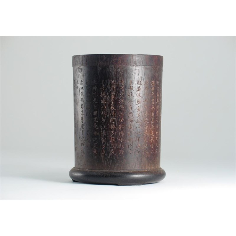 A Chinese hardwood brushpot, finely carved with rows of calligraphy around the body, the base with three feet, 16.5cm.