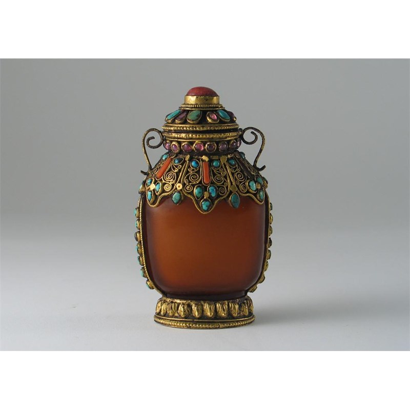 A Chinese agate snuff bottle, mounted in Mongolia in gilt-metal with semi-precious stones, 19th century, 9cm. (2)