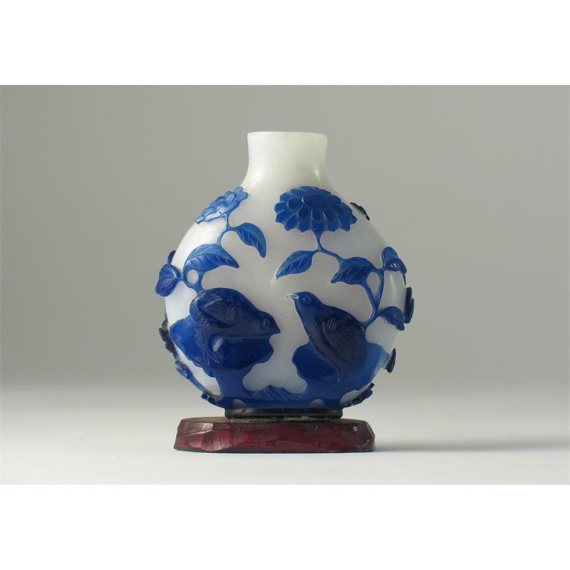 A Beijing glass snuff bottle, decorated with blue birds and flowers on a white ground, 6cm.