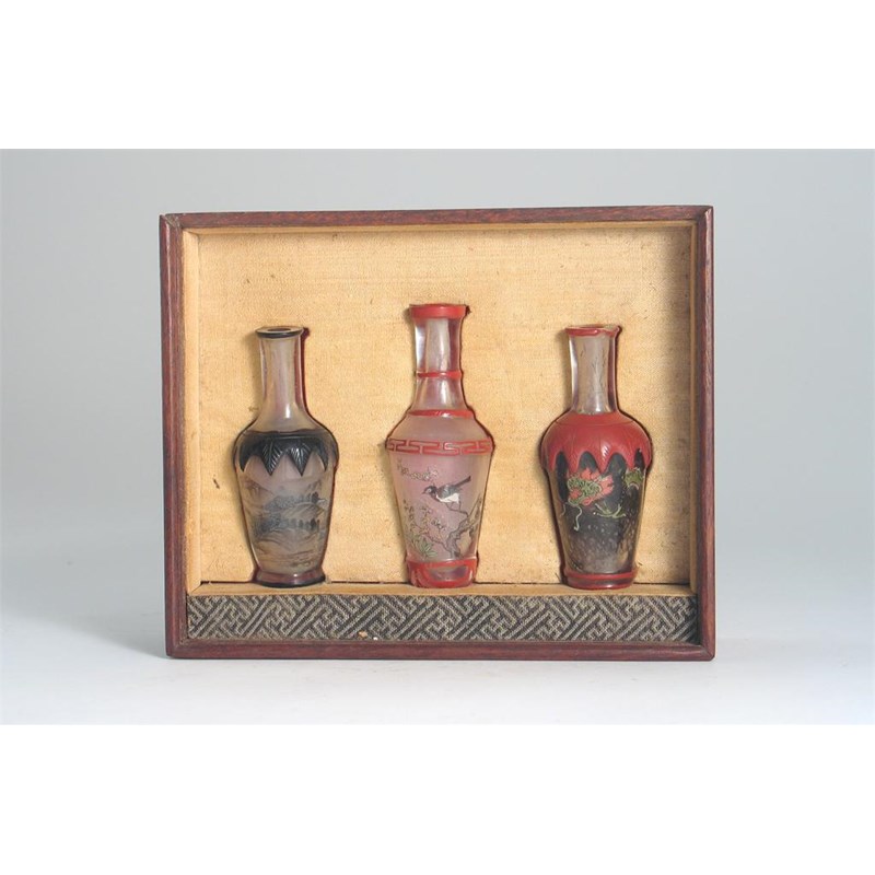 Three Chinese interior painted snuff bottles, decorated with a landscape, a bird and a dragon, 20th century, contained in a fitted case, 8.5cm. (3)