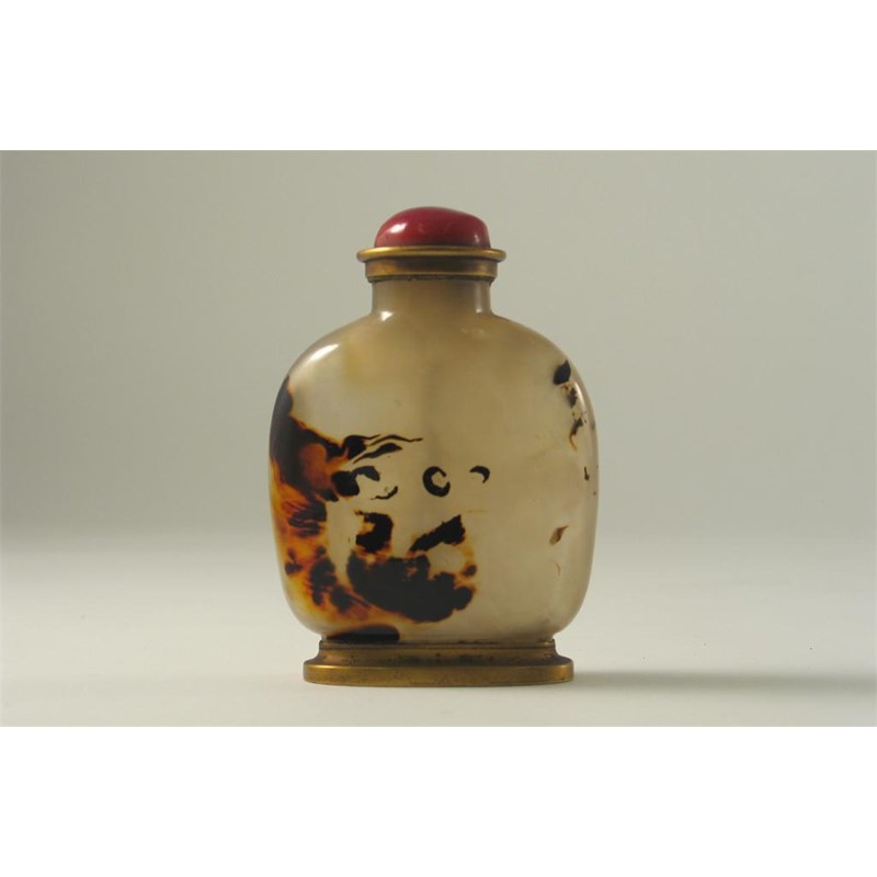 A Chinese chalcedony snuff bottle, the brown inclusions suggesting a mandarin duck, with a hardstone stopper, 19th century, 9.5cm. Unusually converted into a table lighter.