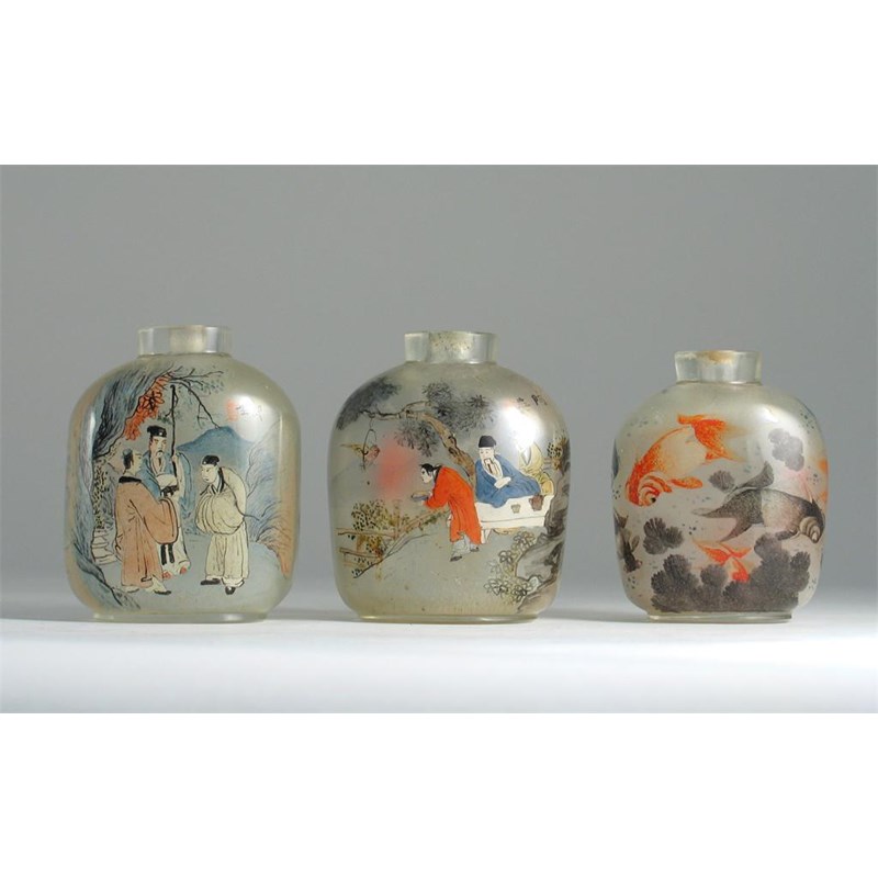 Three large Chinese interior painted snuff bottles, one with fish and two with figures, early 20th century, 8.5cm. (3)