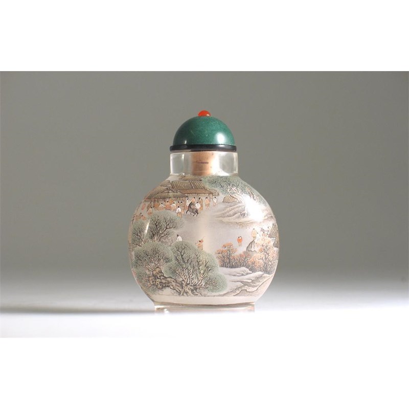 A Chinese interior painted snuff bottle, the with many small figures and animals crossing a bridge and in other daily activities in a village, the shoulder with calligraphy, the stopper jade, 20th century, 7.5cm.