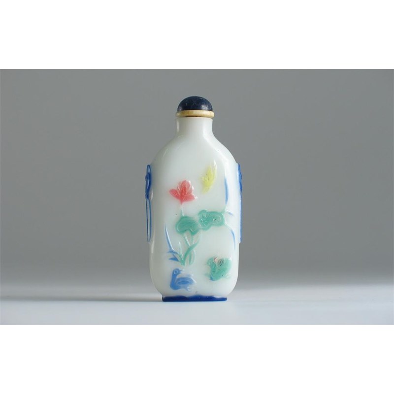 A Chinese Beijing glass snuff bottle, decorated in blue, red, green and yellow with a vase of flowers, birds and insects, probably 18th century, 6.5cm.