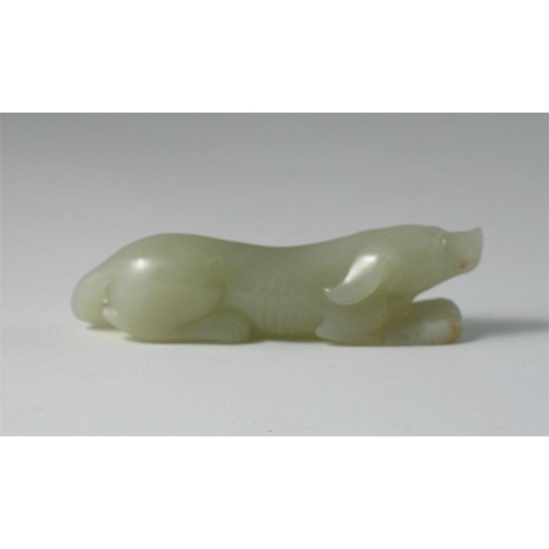 A Chinese pale celadon jade model of a recumbent hound, 19th/20th century, 11cm.