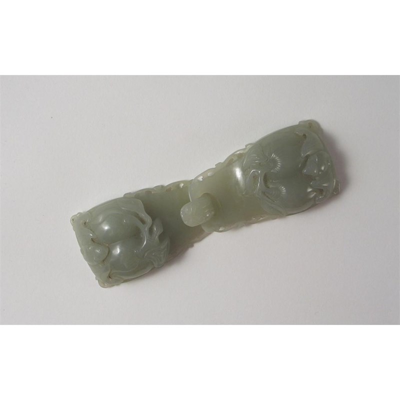 A Chinese celadon jade buckle, carved with bats and melons, 13cm. (2)