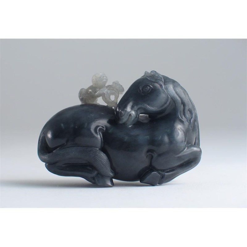A Chinese jade carving of a recumbent horse, his head turned and with a monkey perched upon his back, the stone grading from black to pale grey, the hair finely detailed, 7cm.