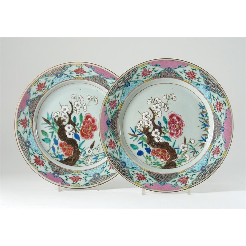 A set of five Chinese famille rose plates, decorated with peony, prunus and bamboo, c.1730-40, 22cm. (5)