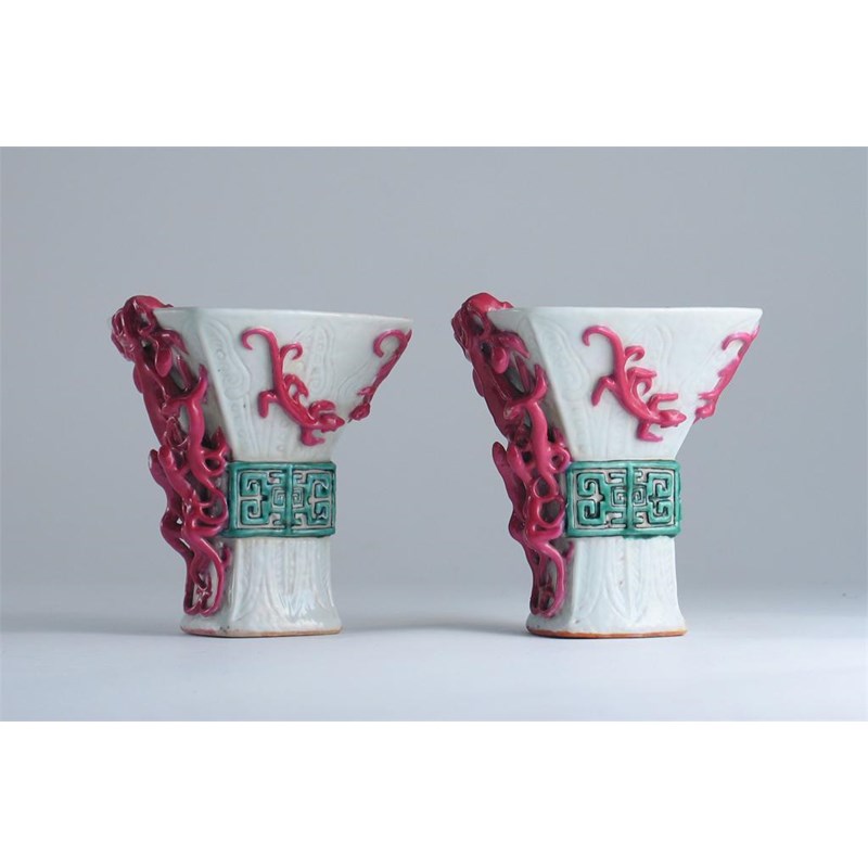 A pair of Chinese porcelain libation cups, with bifid dragon handles, the bodies with stylized motifs around the centres, probably 19th century, 12.5cm. (2)