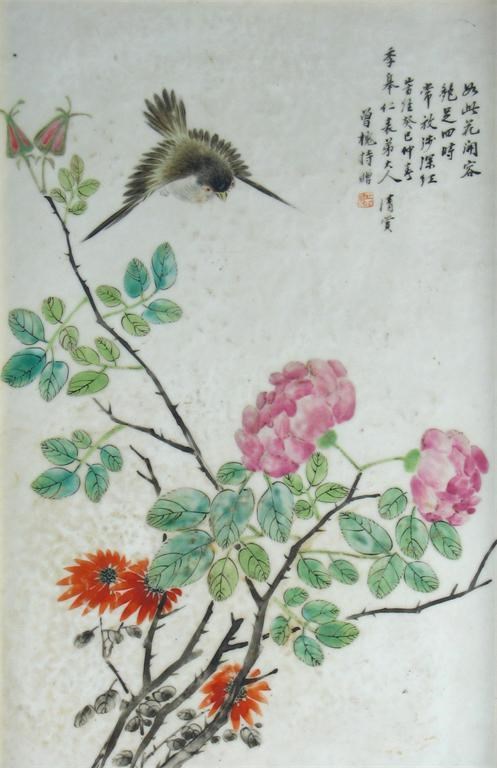 A Chinese famille rose rectangular plaque, painted with a bird about to land upon a rose bush and with six lines of calligraphy, 19th or early 20th century, 36cm. x 24cm.