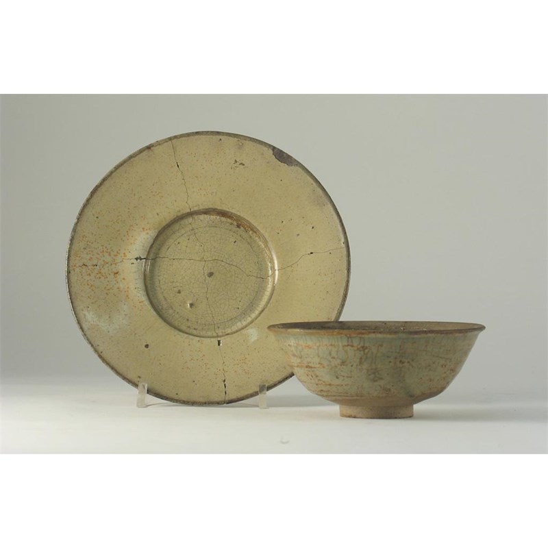 A Chinese yue glazed small incised bowl, and a green/cream glazed shallow dish. Both damaged. 11th century and later, 18cm. (2)
