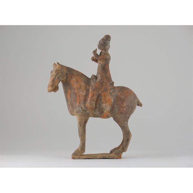 A Chinese red pottery model of a horse and rider, standing four square on a rectangular base, probably Tang dynasty, 32cm.