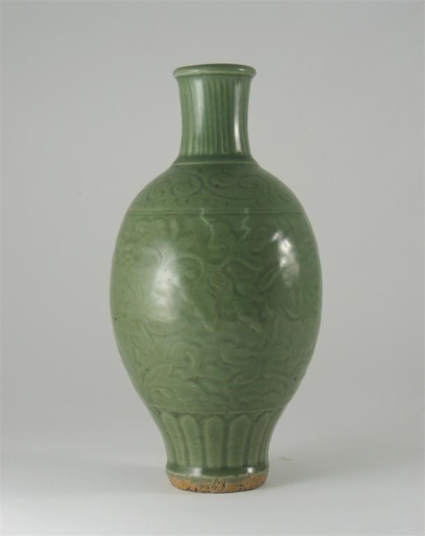 A Chinese Longquan celadon ovoid vase, the body carved with peony flowers and leaves above a wide band of lapets, Ming dynasty, 31cm. Paper label for Spink & Son.