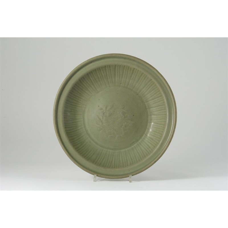 A Chinese Longquan moulded celadon dish. The glaze rubbed. Early Ming dynasty, 27.5cm.