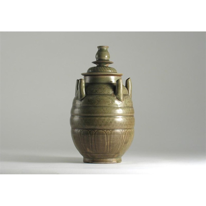 A Chinese celadon glazed yueyao carved jar and cover, moulded with five spouts, the body decorated with combed geometric leaf and ruyi heads. Damage to the rim. Song dynasty c.12th century, 26.5cm. (2)