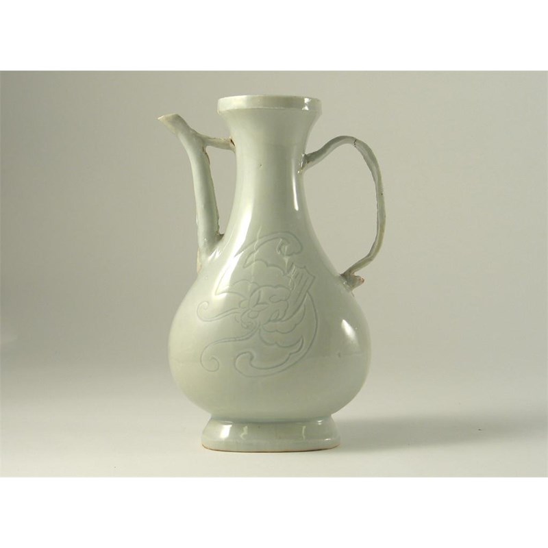 A Chinese Yingxing ewer, carved with a stylized bat to each side. Minor damages, Song dynasty 960-1279 AD, 20.5cm.
