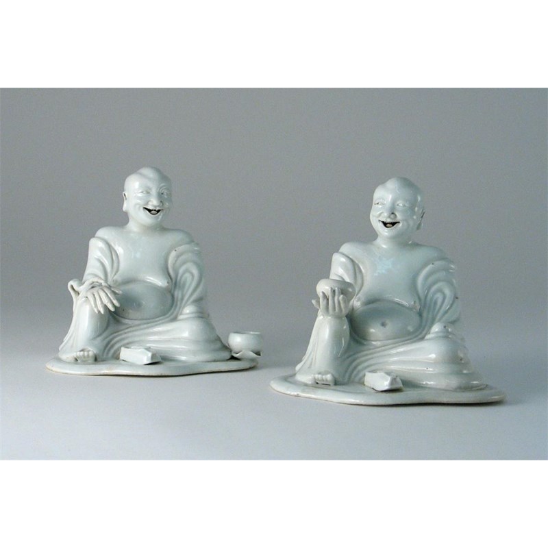 Two Chinese blanc de Chine seated figures of Budai Hoshang, each with a begging bowl and a shoe placed in front of them, each with an impressed seal mark. Each with restoration. 18th century, 10.5cm. (2) Cf. PJ Donnelly, Blanc de Chine, p.88, illustration a, for a similar figure.