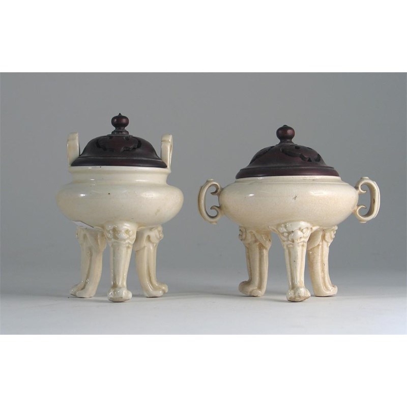 Two Chinese white glazed tripod censers, with wood covers, 12cm. Wide. (4)