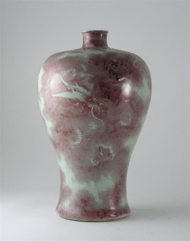 A Chinese meiping decorated in underglaze copper red, with a scaly dragon amidst clouds, the base with a six base character Kangxi mark, but 19th century. A section re-glued. 36cm.