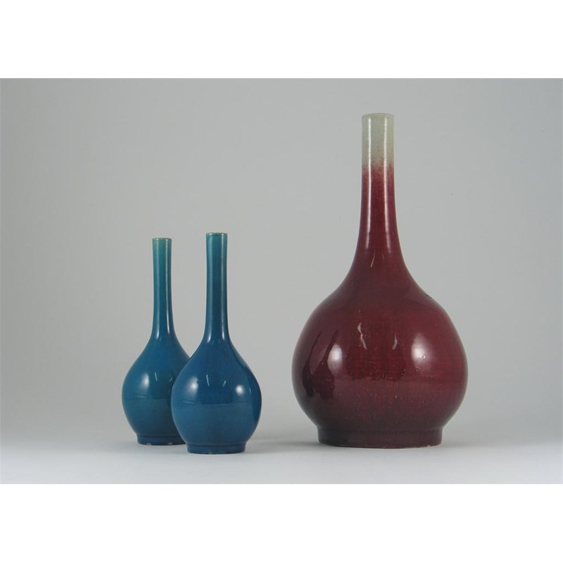 Three Chinese bottle vases, one with a red flamb glaze, the others turquoise. One small vase with a hair crack. 19th/20th century, 39cm. (3)