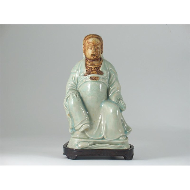 A Chinese celadon seated figure of Guandi, his face and chest unglazed, wood stand, 26cm. (2) Paper label states; Ming Long-chuan Warren E. Cocks collection, New York.